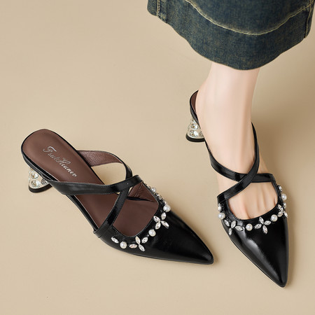 粗跟友好款,通勤穿搭神器,气场全开,名媛风拉满,水钻交叉绑带高跟拖鞋