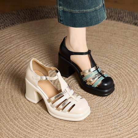 2026新款中空女鞋夏季凉鞋 真皮方头坡跟鞋女鞋单 春秋新款夏季鞋女 包头凉鞋女