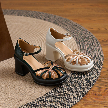 新款时尚尖头头层牛皮防水台细粗跟短靴10厘米跟高33-40